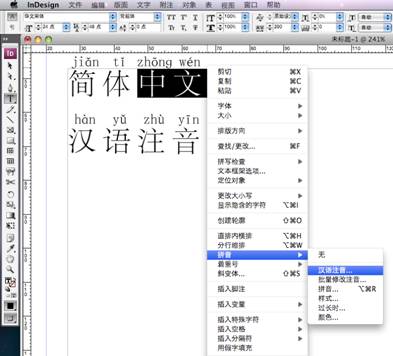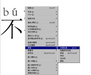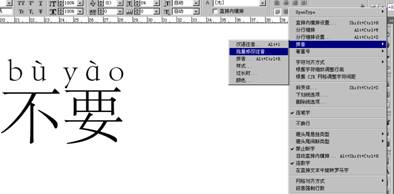 2、用文字工具选择文本对象后,鼠标右键下拉菜单上->"拼音"下拉子菜单->"汉语注音"下拉子菜单(在"拼音..."下拉子菜单前面);